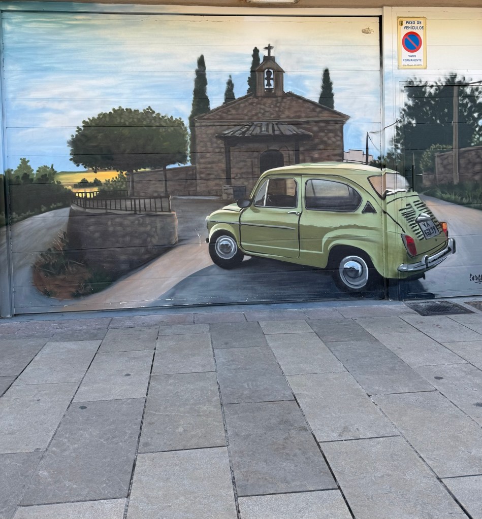 Dans le café. Je prends une tortilla qui me permet de diminuer ma consommation d’oeufs. Ce n’est que de la patate ! Voir la signature : VeroniqueJolie campagne de Castille et ses cloches « dans le mur »Mais pourquoi cette photos de cette maison fleurie derrière chaque fenêtre ?Uniquement du trompe l’oeil !Juste chouetteFaut pas rater la chèvre