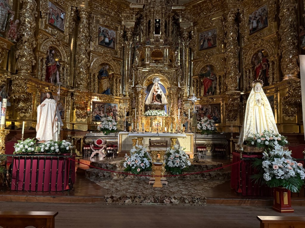 Les bâtiments nous rappellent toujours la fierté de la splendeur historique de l’Espagne. La moindre petite église croule sous les dorures. En ce week-end pascal, les fleurs blanches se rajoutent a la splendeur.