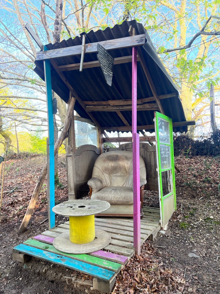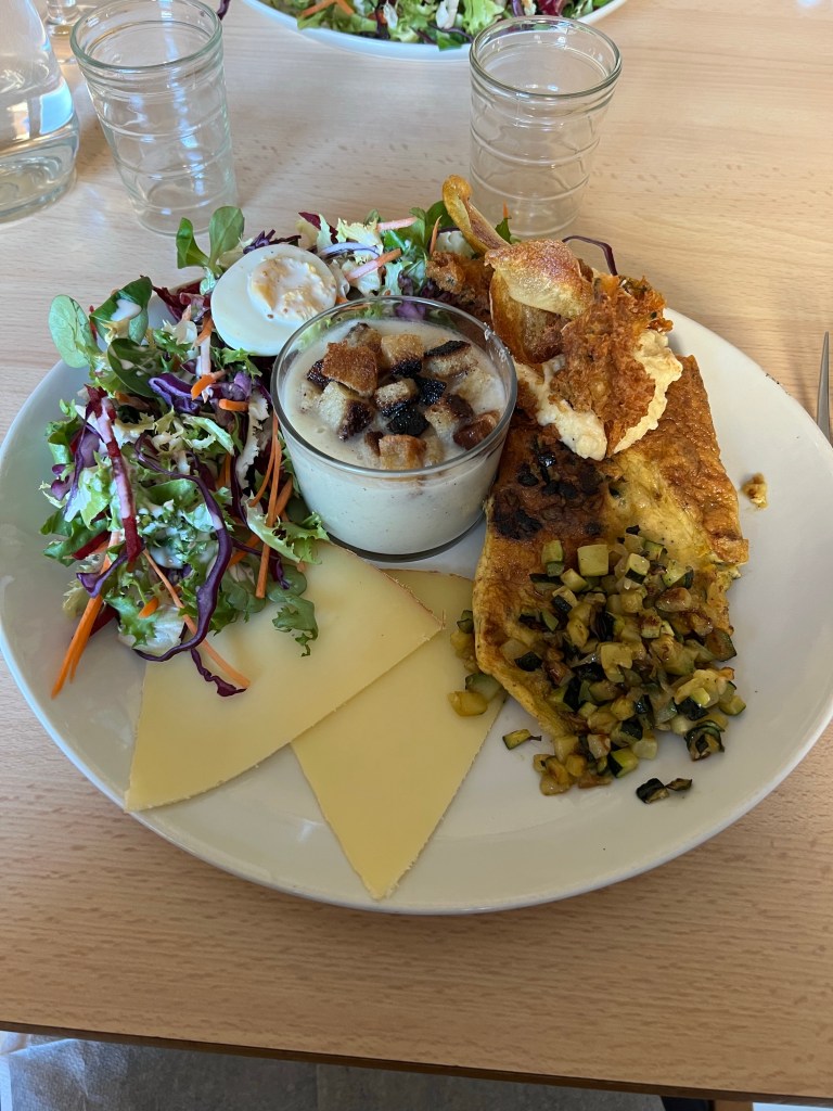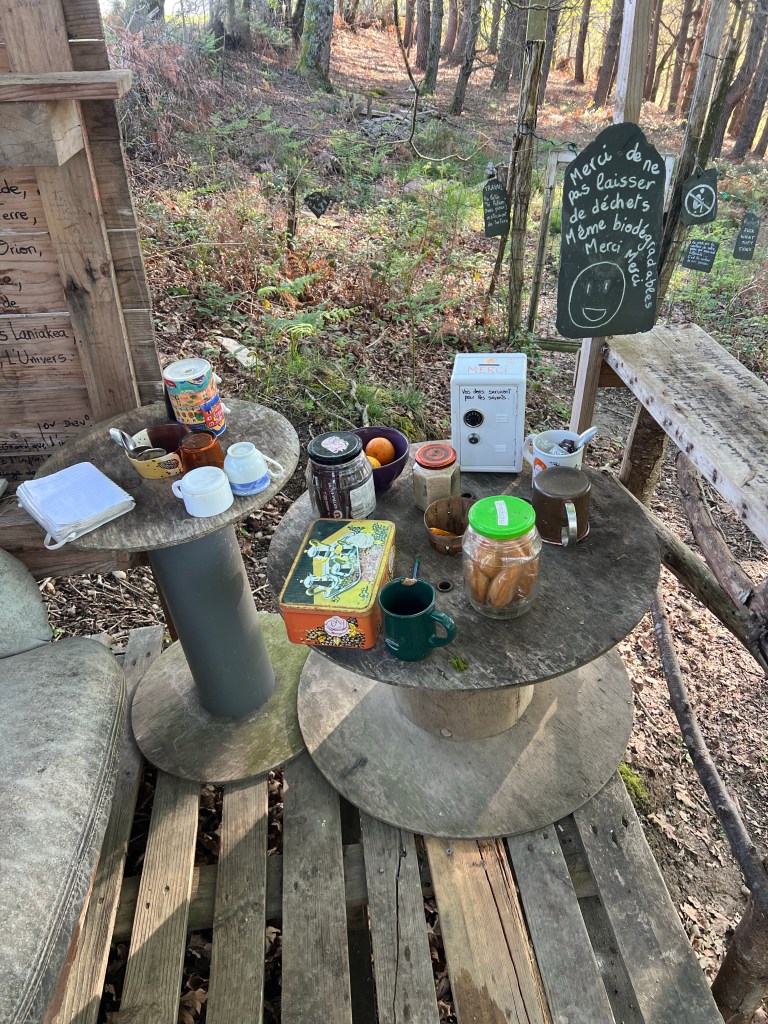 Une minuscule table m’attend ! Un repas royal apres les heures sous la pluie. Ce jour je ne choisirai pas entre fromage et quiche !