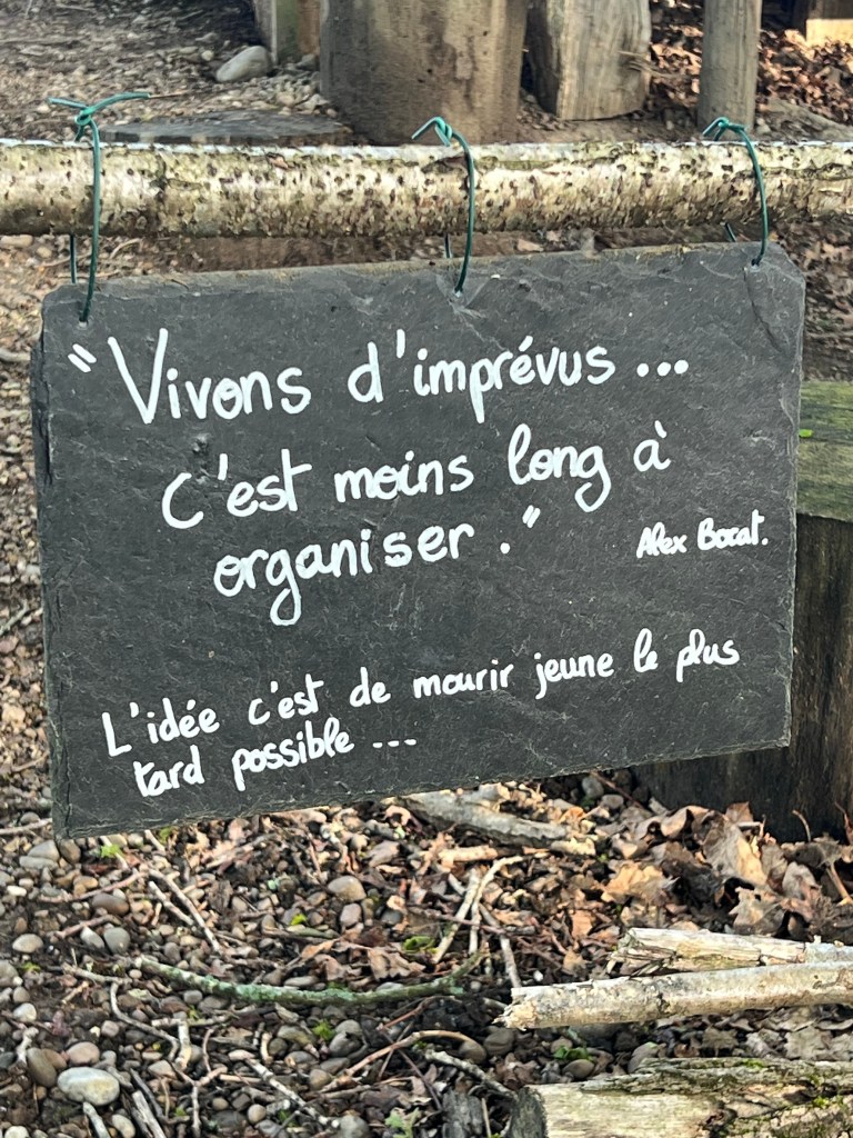 Depuis mon premier départ au Puy-en-Velay, j’ai pu lire des petites phrases sur des ardoises accrochées dans des arbres, toutes signées l’Alchimiste. J’ai fini par m’habituer a ces rencontres qui parfois convoquent souvenirs ou questionnements.