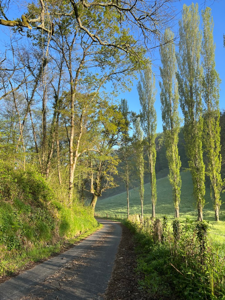 Depart dans le petit matin frais en ensoleille. La campagne deploie ses verts et ses fleurs dans les collines du pays basque.