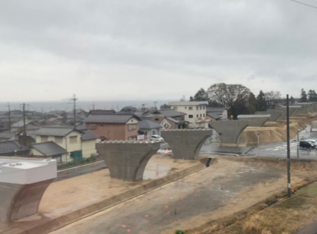 Construction de la ligne du Shinkansen …installation des structures de beton qui porteront les voies.