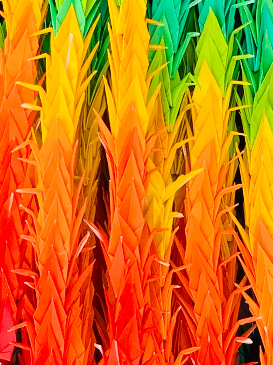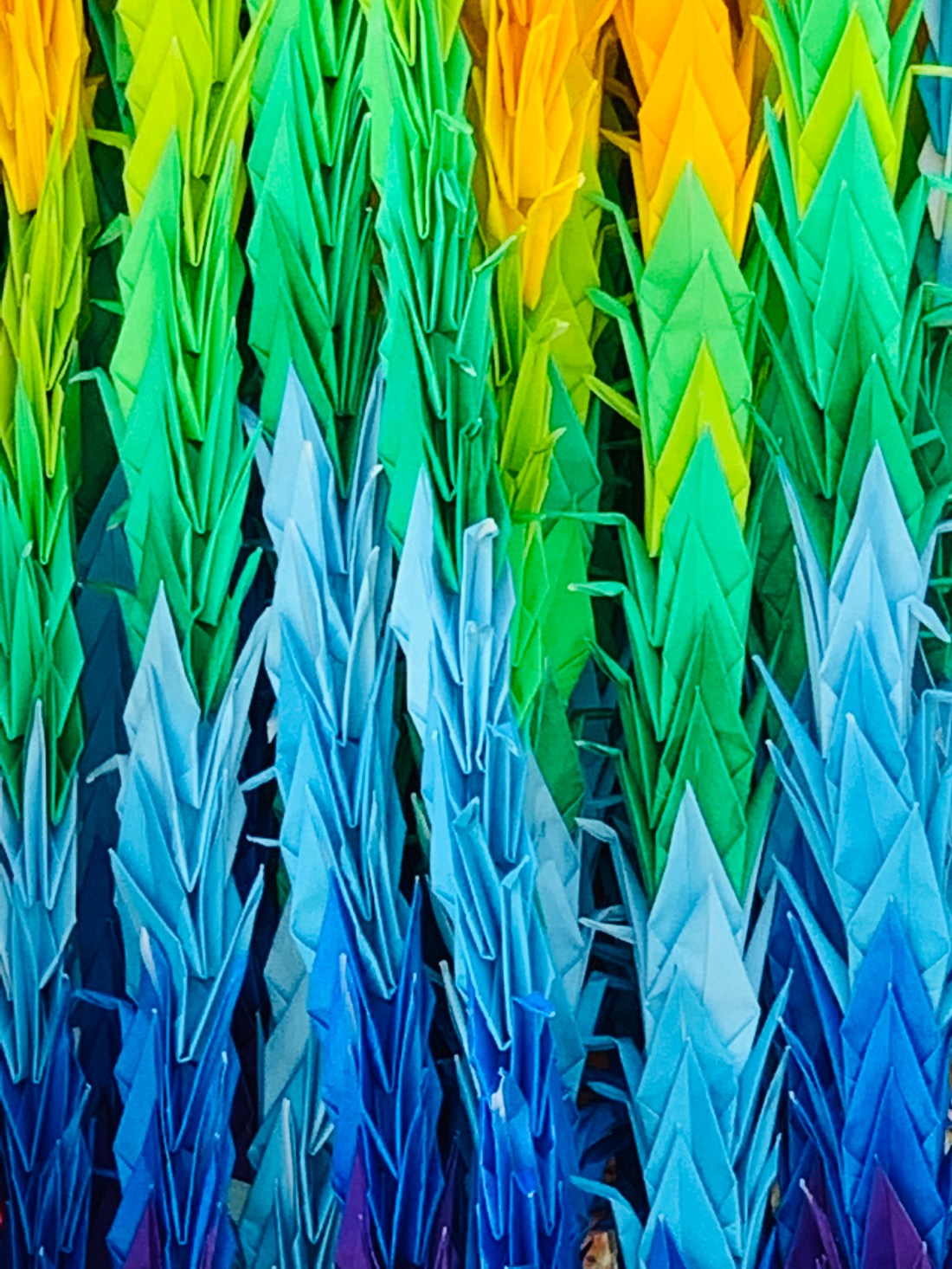 Des milliers ou centaines de miliers de pliages en couleurs pour symboliser les victimes: les orizuru ou grues en papier